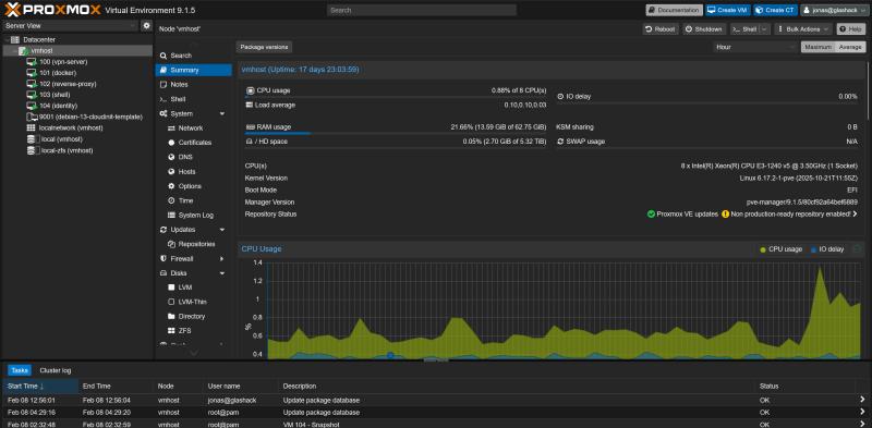Proxmox has a web interface which is available here: https://vmhost.lab.glashack.space/. You can sign in using SSO - see: identity