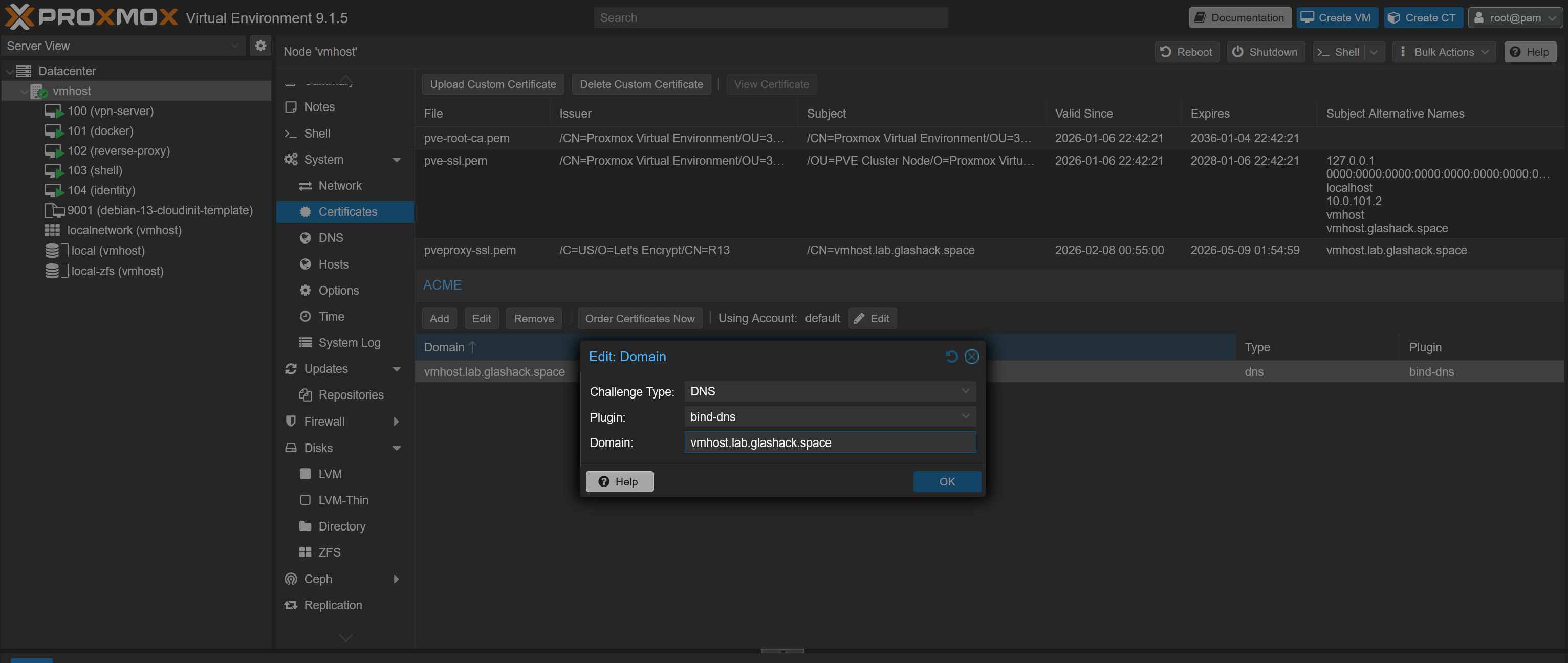 On the specific vmhost in Proxmox under 'Certificates' the following config can be created (using the bind-dns plugin defined earlier). Then click 'Order Certificates Now' to run the DNS challenge and get the HTTPS certs.
