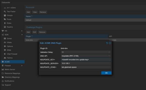 The key can be base64 encoded by running cat my.key | base64 -w 0 (where my.key contains the full output of the tsig-keygen command). This encoded string is then used in the Proxmox datacenter config shown below: