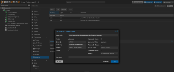 We have a Keycloak instance which is used to provide identity services in the hackerspace. This is configured in Proxmox under Datacenter > Permissions > Realms: