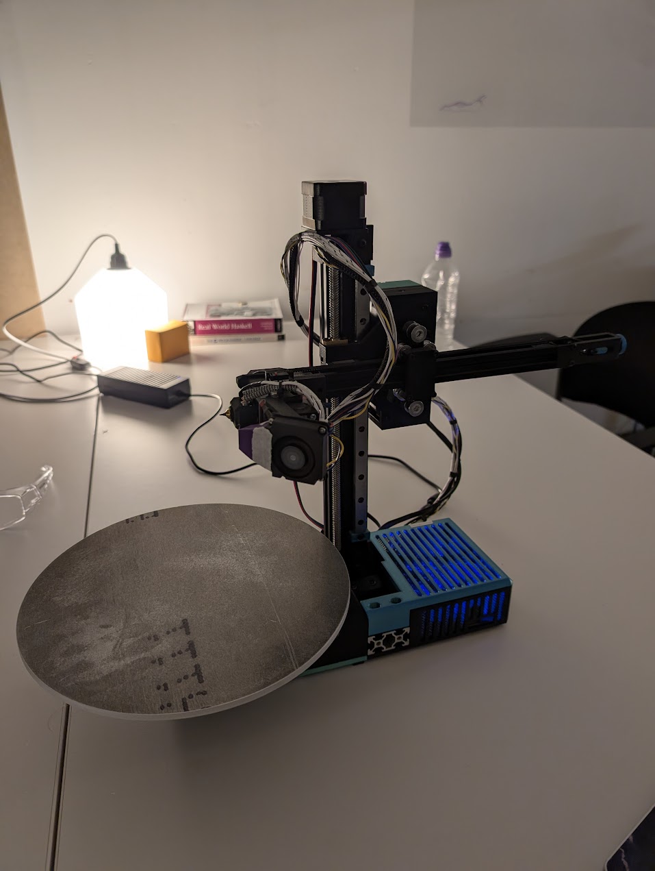 The bed is an unheated circle of aluminium that can be adjusted via three thumb screws under it. You will need masking tape covered with glue stick that has been left to dry out to get decent adhesion. It's primitive stuff, but have you seen the price of slip rings?!