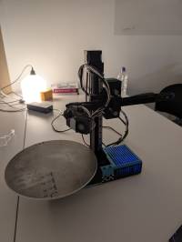 This is an experimental 4 axis non-planar 3D printer originally designed by Joshua Bird for use with his S4 non planar slicer. The original design and firmware has been modified a bit by Zoe and Kate F to make it only slightly less difficult to use. It runs RepRap Firmware on a Fly E3 Ultra mainboard with an ESP32 hosting the web frontend at theta.local.